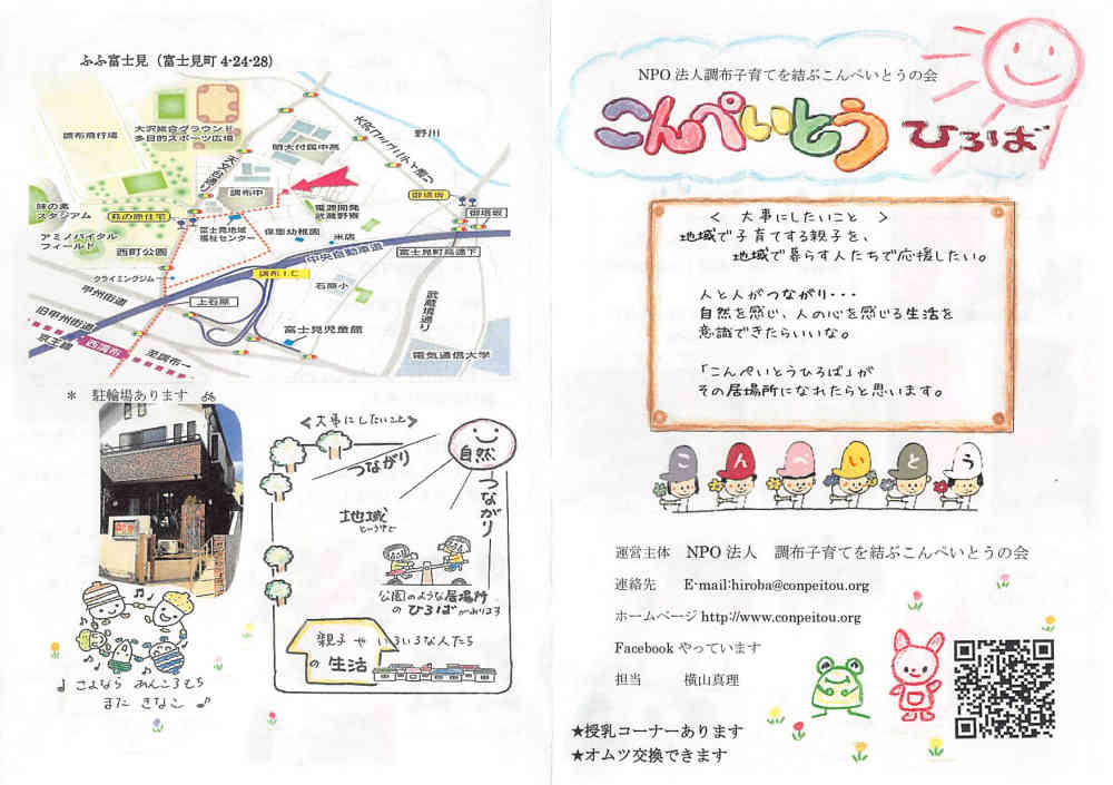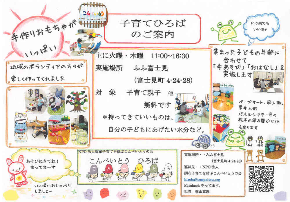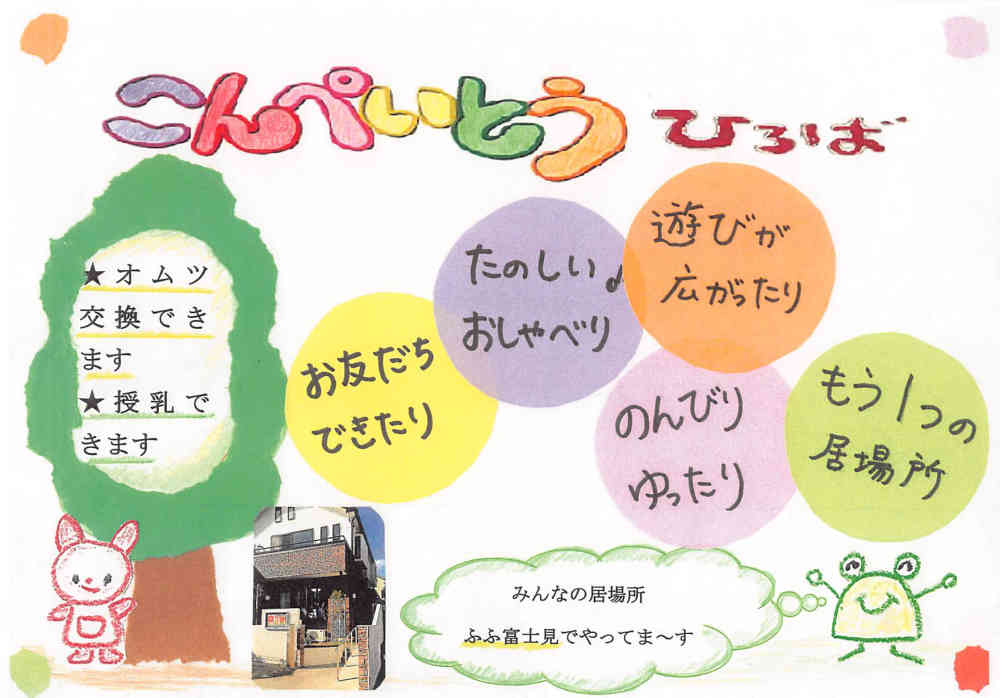 地域の親子のちょっとした居場所になったり、人と人をつないで見守りの輪を広げたりして、子育てする親子を中心にした、地域に暮らす様々な人たちと相互に関わることで、より良い生活につながるように援助できたらと考えています。